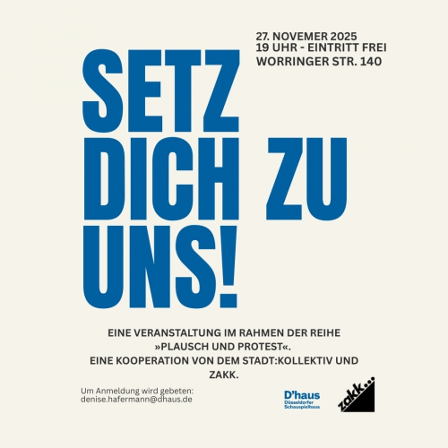 Eine Veranstaltung im Rahmen der Reihe »Plausch und Protest«. Setz dich zu uns! ist eine Kooperation von dem Stadt:Kollektiv und zakk.